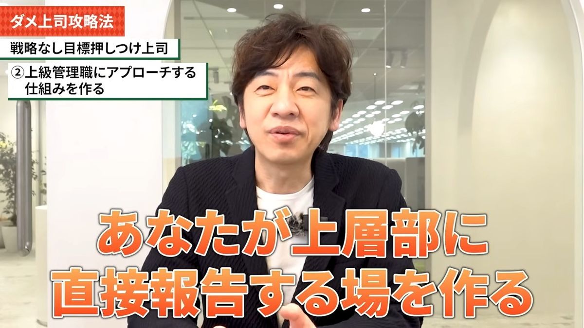 木下:そして次、「上級管理職にアプローチする仕組みを作る」。このタイプの上司は上級管理職と直接話をするのを避けがちなんですね。人を説得するのが苦手な方です。あなたが上層部に直接報告する場を作るかたちにしたほうが良いと思います。