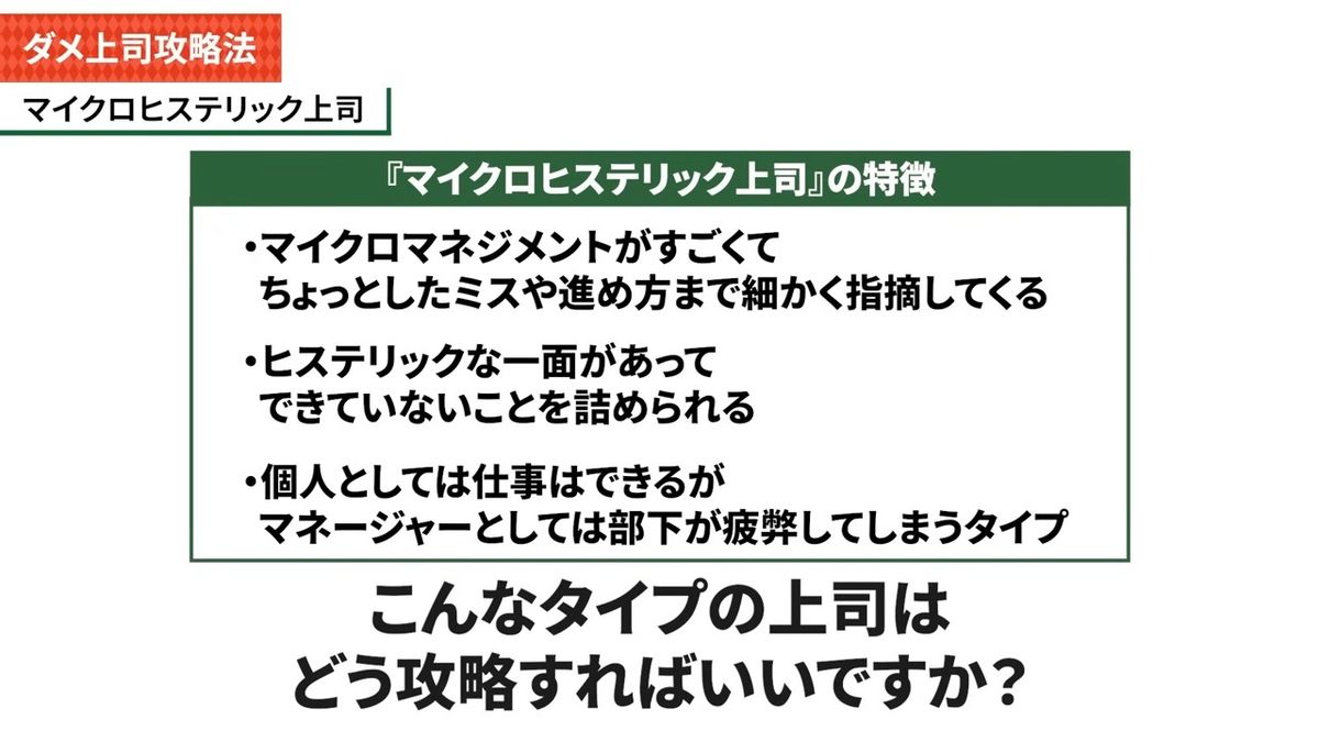 1人目、「マイクロヒステリック上司」。特徴はマイクロマネジメントがすごくて、ちょっとしたミスや進め方まで細かく指摘してくる。ヒステリックな一面があって、できていないことを詰めてくる。個人としては仕事ができるが、マネージャーとしては部下が疲弊してしまうタイプ。こんな上司の場合はどう攻略したらいいでしょうか。