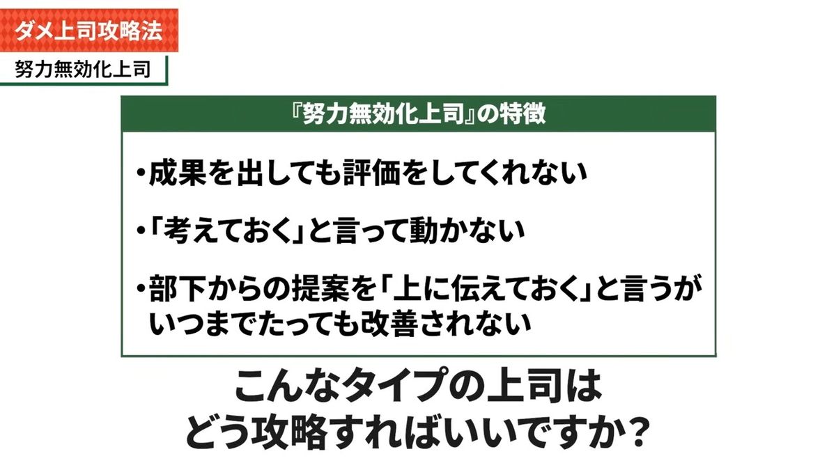 ——攻略法を考えるとどんどん楽しくなってきました。3人目は「努力無効化上司」です。特徴は、成果を出しても評価してくれない。「考えておく」と言って動かない。部下からの提案を「上に伝えておく」と言うが、いつまで経っても改善されない。こんなタイプの上司はどう攻略すればいいでしょうか。