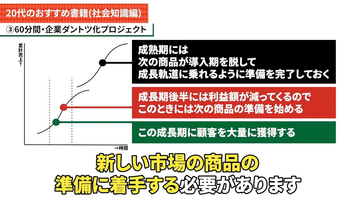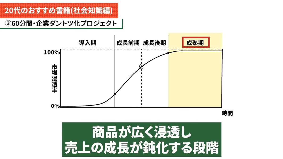 (市場に)入る時は市場が伸びている成長期の前半に入ってください。導入期に入るとまだまだ市場ができていないので立ち上がるのに苦労しますし、成熟期に入るとすでに先発の企業が市場シェアを取っちゃっているので、なかなか自分たちが入ってはいけない(からです)。そして成長期の後半になってくると、次の新しい市場に向けて準備をしてみてください。