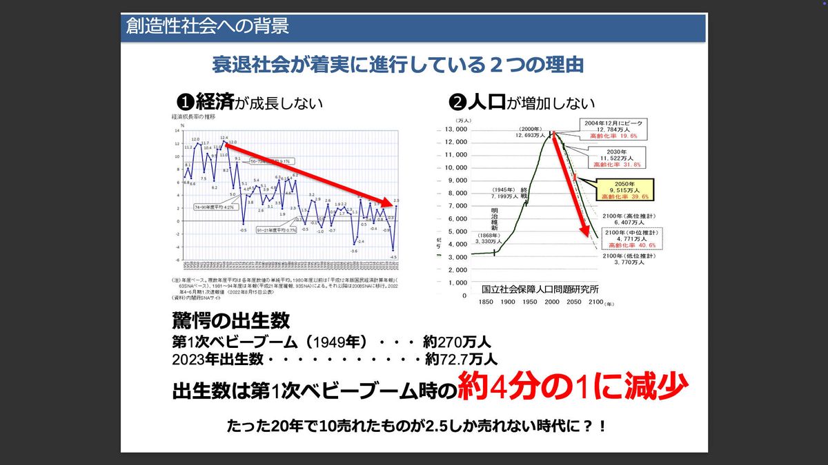 ・柴田雄一郎氏は、日本の経済成長率が世界176位まで落ち込み、人口減少が加速する中で、従来のビジネスモデルでは立ち行かなくなると指摘。