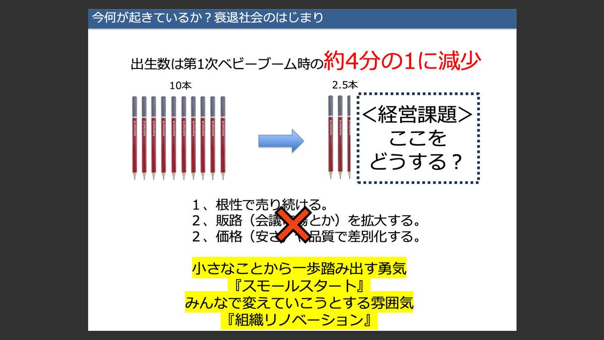 では、何をするべきか。ここが経営課題として問われるポイントです。今まで成長していた部分が衰退していく以上、どこかでその穴を埋める必要がある。その手段として考えられるのが、根性で売る、販路を海外に広げる、価格を下げて競争力を高める……といった策ですが、これらはどれも限界がありますし、持続的ではありません。