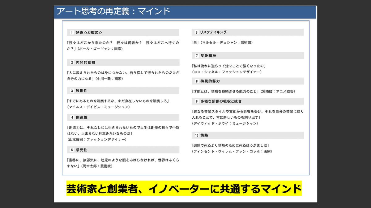 私の中では、アート思考のアーティストのマインドというのは、創業者やイノベーターと非常に近いものだと捉えています。これは本の中でも詳しく書いているのですが、アーティストが持っている資質を10個に分解して、それぞれの資質に対応するアーティストの言葉を紹介しています。