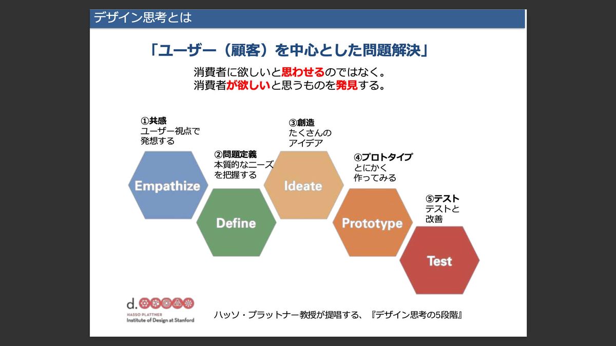 これは顧客を中心とした問題解決のプロセスであり、ユーザーに共感し、ユーザーの視点で発想するというのが基本です。つまり、開発者側の視点ではなく、ユーザーの視点です。