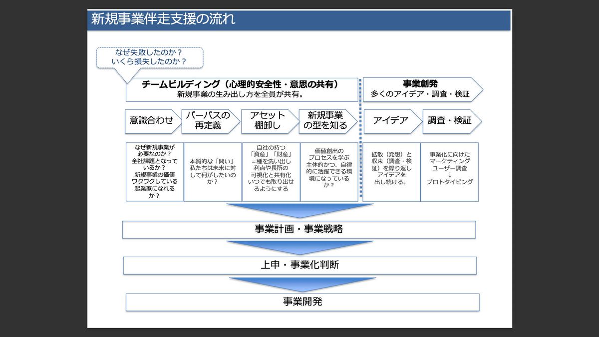 また、私が常にお願いしているのは、やったことのないこと、見たことのないことに取り組むのだから、「それはやっちゃだめ」「事例がないから無理」といった否定から入る姿勢は、新規事業の妨げになるということです。
