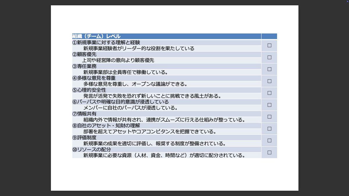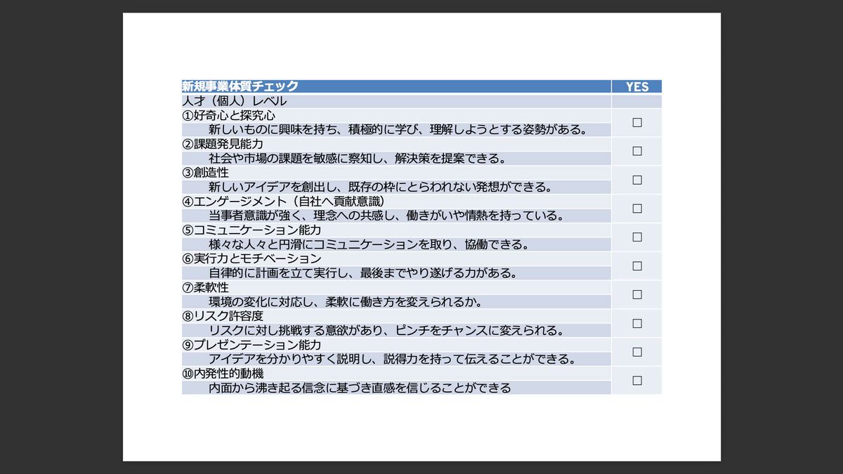 こうしたいくつかの観点から、チェックリストを通じてご自身や自社の状態を点検していただければと思います。新規事業に取り組む上での土台や適性がどれだけ整っているかを知るきっかけになればうれしいです。私の話はこれで以上となります。ありがとうございました。