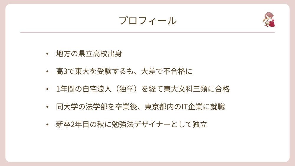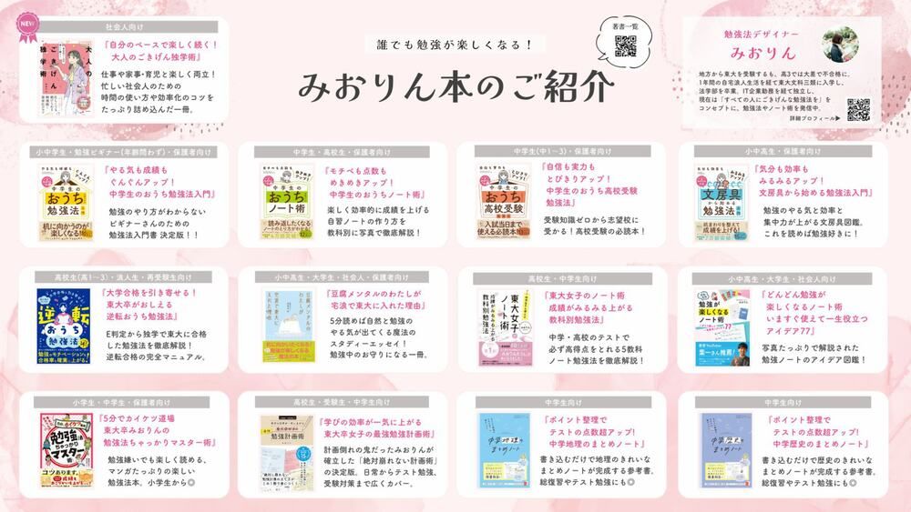 ただ、YouTubeだけではなくて書籍やSNSやブログとか、媒体を問わずいろいろなものを通して楽しい勉強法やノート術、お子さんから大人まで使える勉強法を発信するのが私の仕事かなと思って、このように名乗らせていただいています。