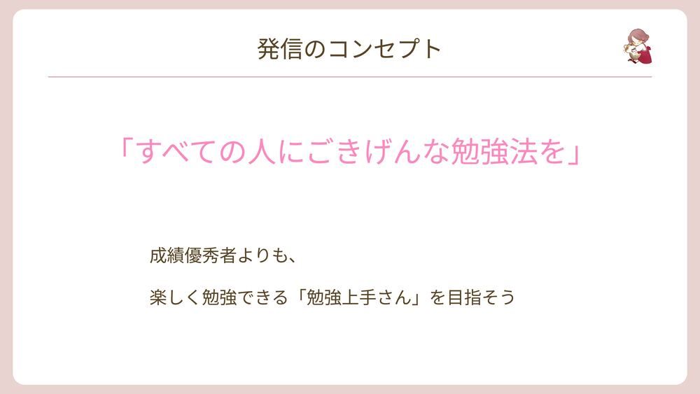 みおりん:私が発信の合言葉として、この「すべての人にごきげんな勉強法を」というものを言っているんです。学力が高い、偏差値が高い、いい資格に合格する成績優秀者さんももちろんかっこいいし大事なんですが、それよりもまずは楽しく勉強できる「勉強上手さん」になることのほうが大事ですよね、そこを目指すのがいいですよねということで、こういった発信をしています。