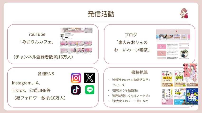 みおりん:そうですね。もともと私の発信は大学生の時のブログから始まっておりまして、そのブログは「東大みおりんのわーいわーい喫茶」というものですね。そこから派生してYouTubeがあったり、SNSがあったり、書籍があったりという感じです。