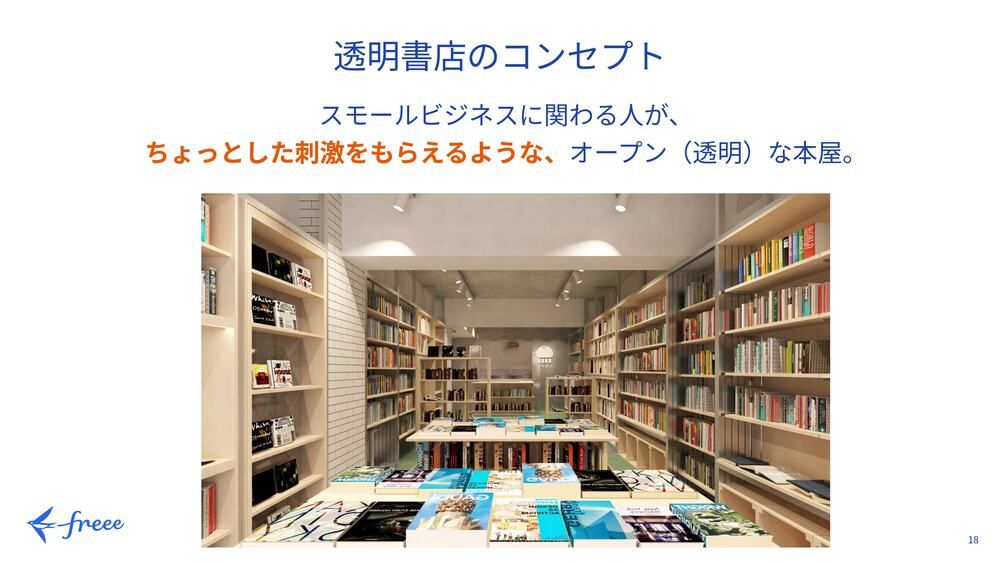 遠井:透明書店は、会計や人事労務のクラウドバックオフィスサービスを提供しているfreeeという会社のグループ会社として運営しております。freeeは「スモールビジネスを、世界の主役に。」というミッションで、さまざまな個人事業主の方や小さな会社を経営されている方の、特にバックオフィス周りを助けるようなプロダクトを提供しています。