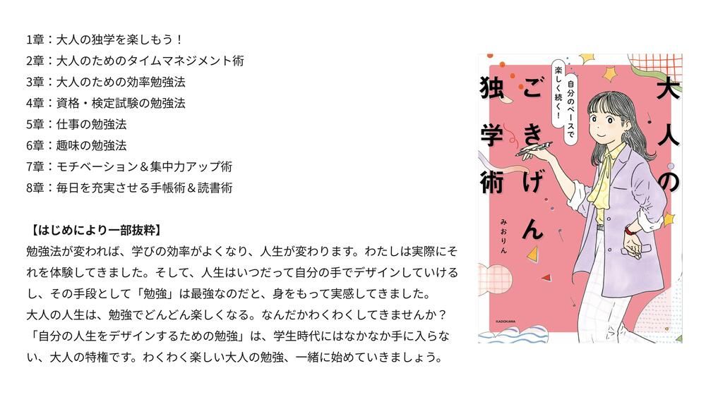 みおりん:基本的な章の構成としては、「時間術」「モチベーションアップ術」「ノート術」「効率的な勉強法」があって、それはどの勉強にも使えることです。それにプラスして、「資格試験の勉強法」「仕事の勉強法」「趣味の勉強法」という章を章立てで分けていて、そこは目的別に選んでいただけたらなという感じですね。
