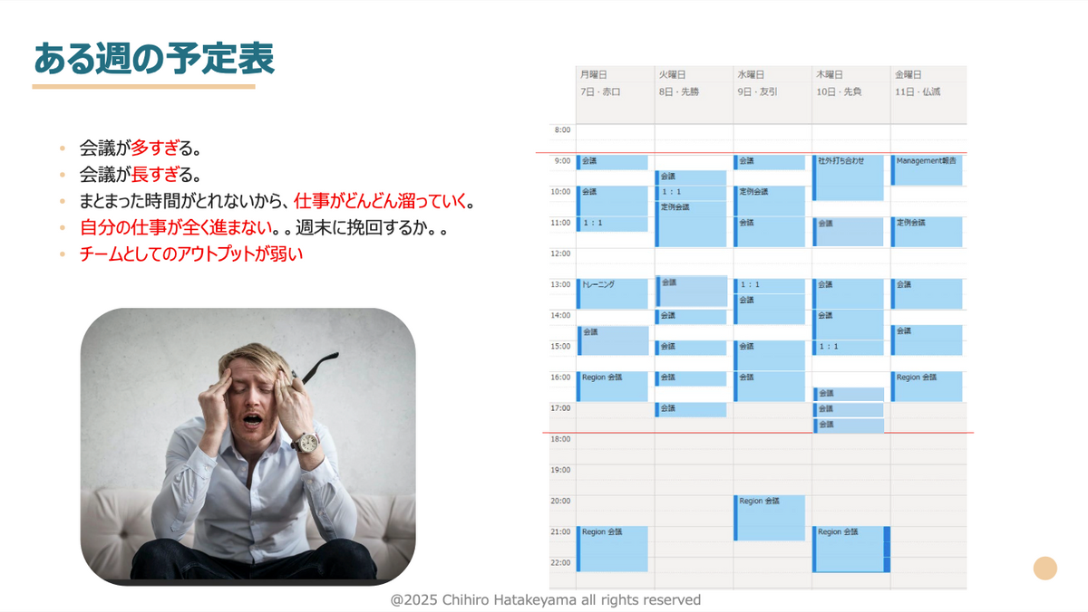 畠山:まずは「会議だらけの日々」。これが実際の私の日々でした。(スライドの)右側がある週のスクリーンショットになりますが、とにかく会議でどんどんブロックされていました。