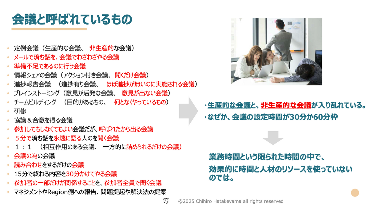 特に情報シェアの会議ですね。別に会議をする必要はないんですけど、ただ「これはこうです」と聞くだけの会議がある。