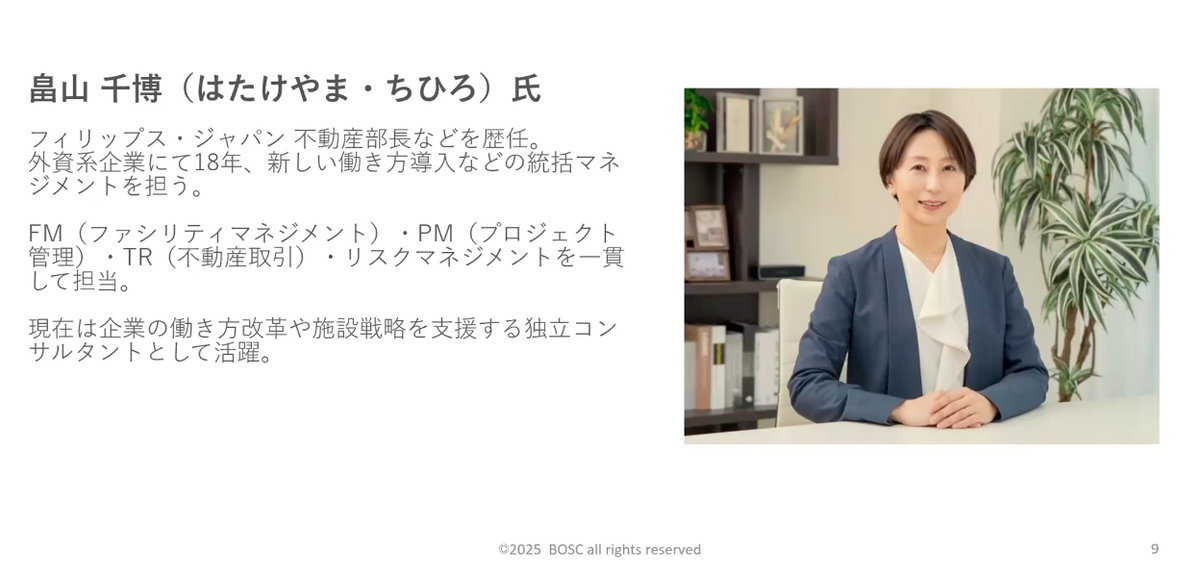 本日ご登壇いただくのは、オランダに本社のあるフィリップス・ジャパンで不動産部長を勤められて、現在は企業の働き方改革やその施設戦略、ファシリティ戦略をご支援なされている畠山千博さんです。