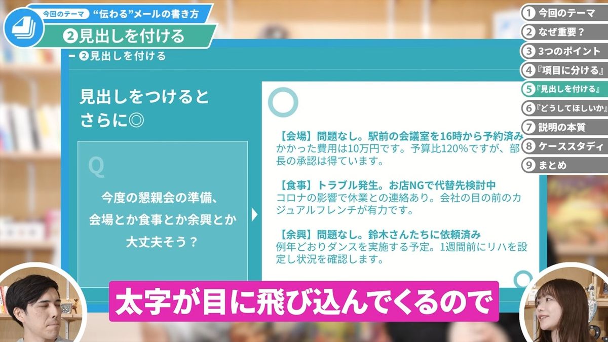 豊間根:2個目が、これも項目の話に近いんだけども、「見出しをつける」という話です。例えば、「今度の懇親会の会場や食事や余興(の準備)は大丈夫そう?」と言われた場合に(次のような返事をするとします)。