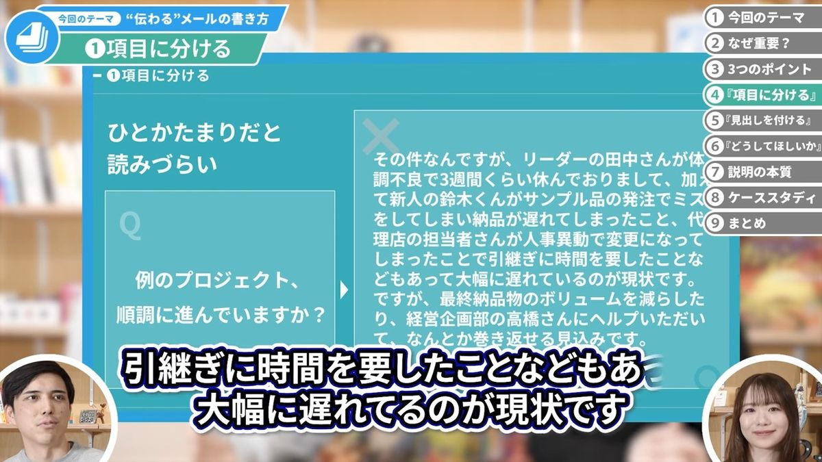 「例のプロジェクトは順調に進んでいますか」と聞かれて、「その件なんですが、リーダーの田中さんが体調不良で3週間ぐらい休んでおりまして、加えて新人の鈴木君がサンプル品の発注でミスをしてしまい納品が遅れてしまったこと、代理店の担当者さんが人事異動で変更になってしまったことで引き継ぎに時間を要したことなどもあって、大幅に遅れているのが現状です。ですが、最終納品物のボリュームを減らしたり、経営企画部の高橋さんにヘルプをいただいて、なんとか巻き返せる見込みです」とぐちゃっとひと固まりで言われると、めっちゃ読みづらいです。