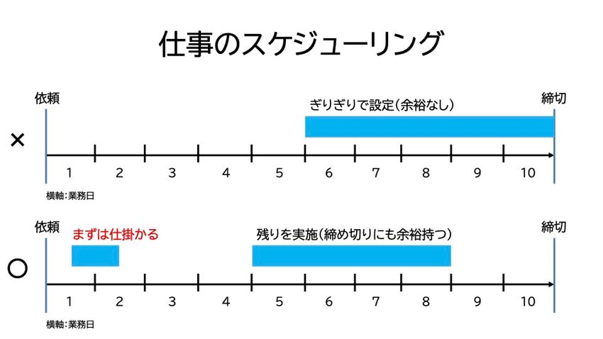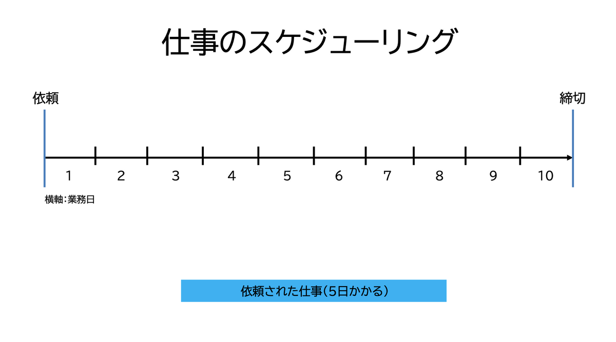 じゃあ10日後の10日が締め切りだとして、依頼されたのが0日目だとします。実際に依頼された仕事が5日ぐらいかかるかなと見込んだ時に、どうやってスケジューリングするかを、例として書かせていただきました。