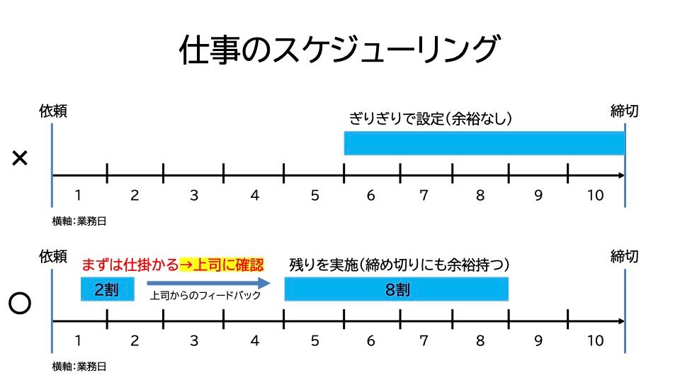 ・完成後の報告より「2割程度での進捗共有」が効果的で、締め切り前の提出が評価につながります。