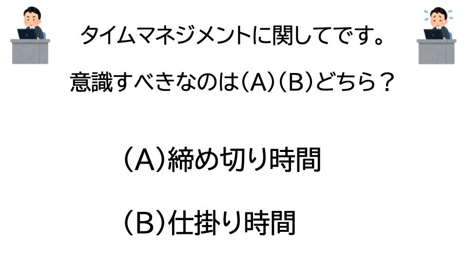 タイムマネジメントに関してです。「意識すべきなのは、A・Bどちらでしょうか」。A、締め切り時間。B、仕掛かり時間。これはいろんなケースがあるので、もちろんその場その場で違いはあるんですけれども、意識していただきたいという意味での問いかけとなります。
