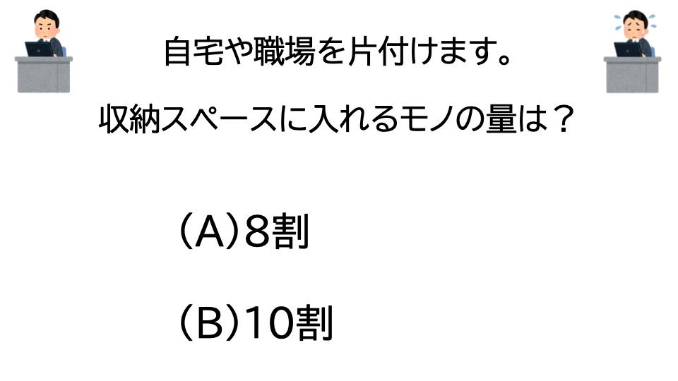 大村信夫氏:じゃあ、こんな感じでもう1個だけ、片付けの物理的なところを伝えさせてください。「自宅や職場を片付けます。収納スペースに入れる物の量はどのぐらいの目安にすればいいでしょうか」。A、8割。B、10割です。こちらはどうでしょう? Aのほうが多めですね。ありがとうございます。