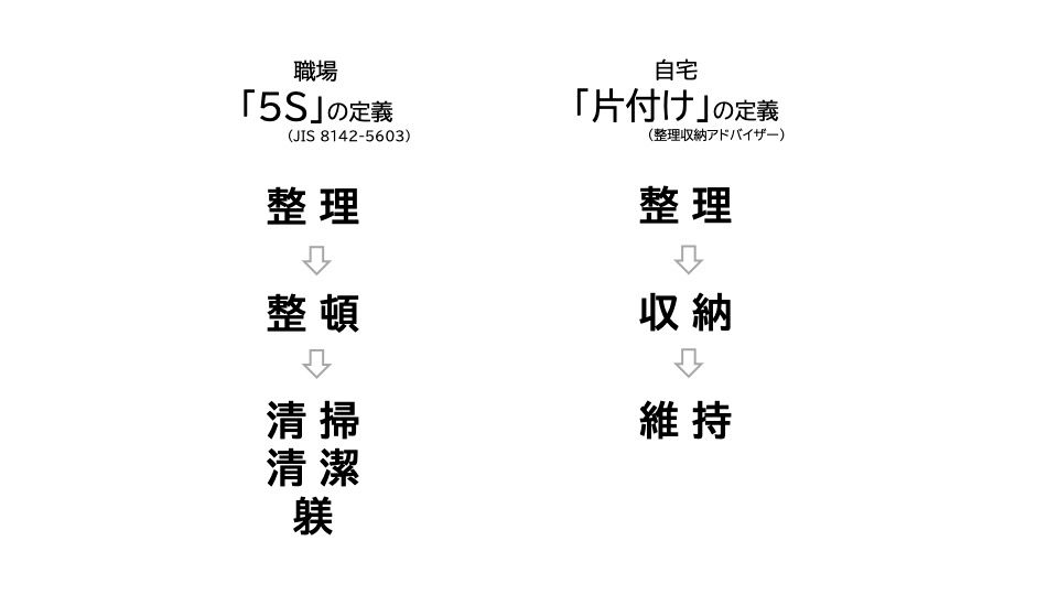 整理、整頓、清掃、清潔、躾。ローマ字で書くとすべてSから始まるので5Sと言われていますが、JIS規格において、片付けの定義はこの順番となっております。