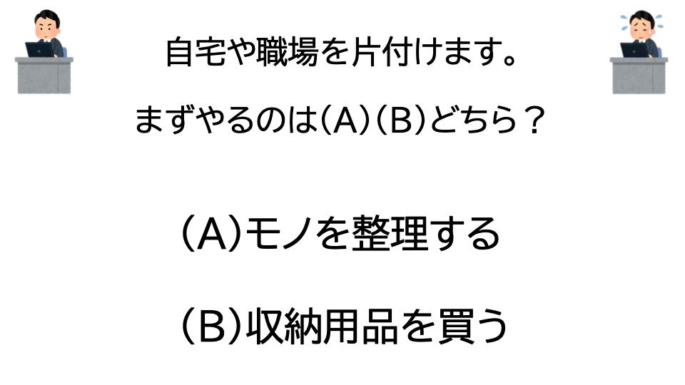 じゃあ、いきなりなんですけれども、このような問題を出させていただきます。「自宅や職場を片付けます。まずやるのはAかBかどちらでしょうか?」。「物を整理する」がA、「収納用品を買う」がBでございます。