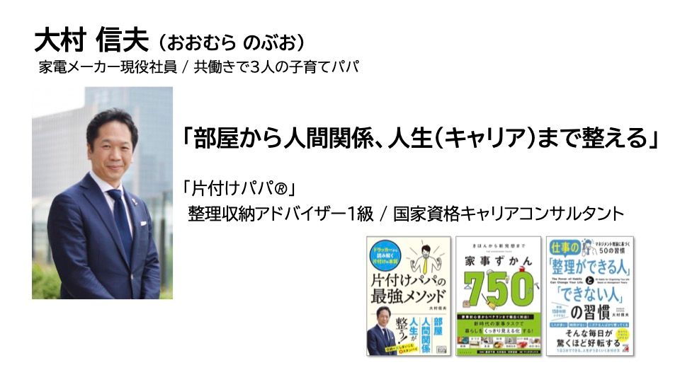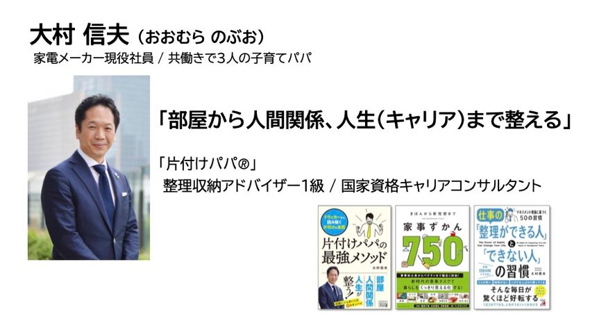 ・「片付けパパ」として活動する大村信夫氏は、整理収納アドバイザー1級の資格を持ち、整理整頓の徹底が主体的なキャリアにつながるという考え方を提唱します。
