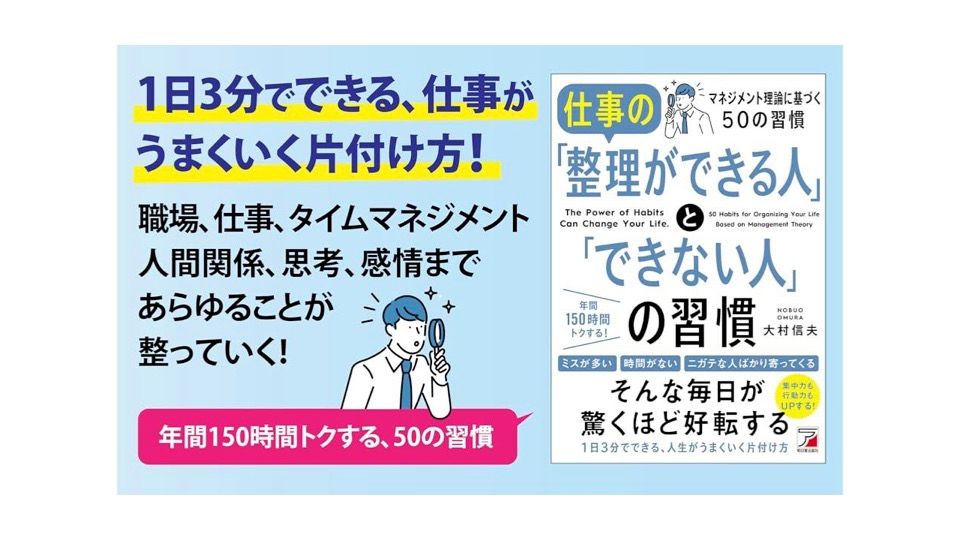大村:今回のテーマにしている書籍(『仕事の「整理ができる人」と「できない人」の習慣』)は2024年11月に発売されました。おかげさまですぐに2回ほど増刷されて、けっこういい感じで販売されております。そこでは、「1日3分でできる、仕事がうまくいく片付け方」みたいなテーマで、約50のテーマ・習慣に沿ってお話をさせていただいています。