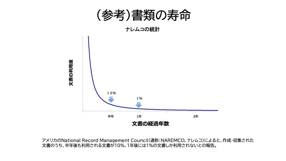 これは書類の例ですけれども、経験的に、物もだいたい同じような法則があると思っております。1年間使われなかったら、その後に使われる可能性は1パーセントもない。そうやって、ある程度の目安ができるといいんじゃないかなと思っております。