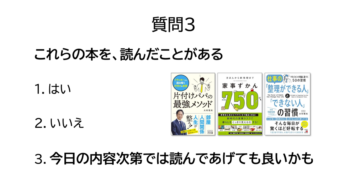 大村:じゃあ、1つ目の質問です。「ご自宅はいつもきれいに片付けられている?」。いきなり「1番で」と言っていただいた方がいますね。あ、今日は1番の方が多めですけど、だいたい同じぐらいな感じですかね。ありがとうございます。いいですね。みなさん反応が早いです。