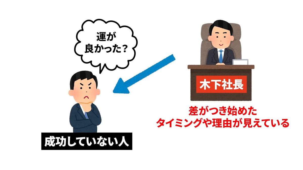木下勝寿氏:では次ですね。これを1つの仕事のできる・できないではなくて、成功する人・しない人という高いレベルで見ていきたいと思うんですけども、まず成功していない人から成功している人を見るとこう見えますよね。
