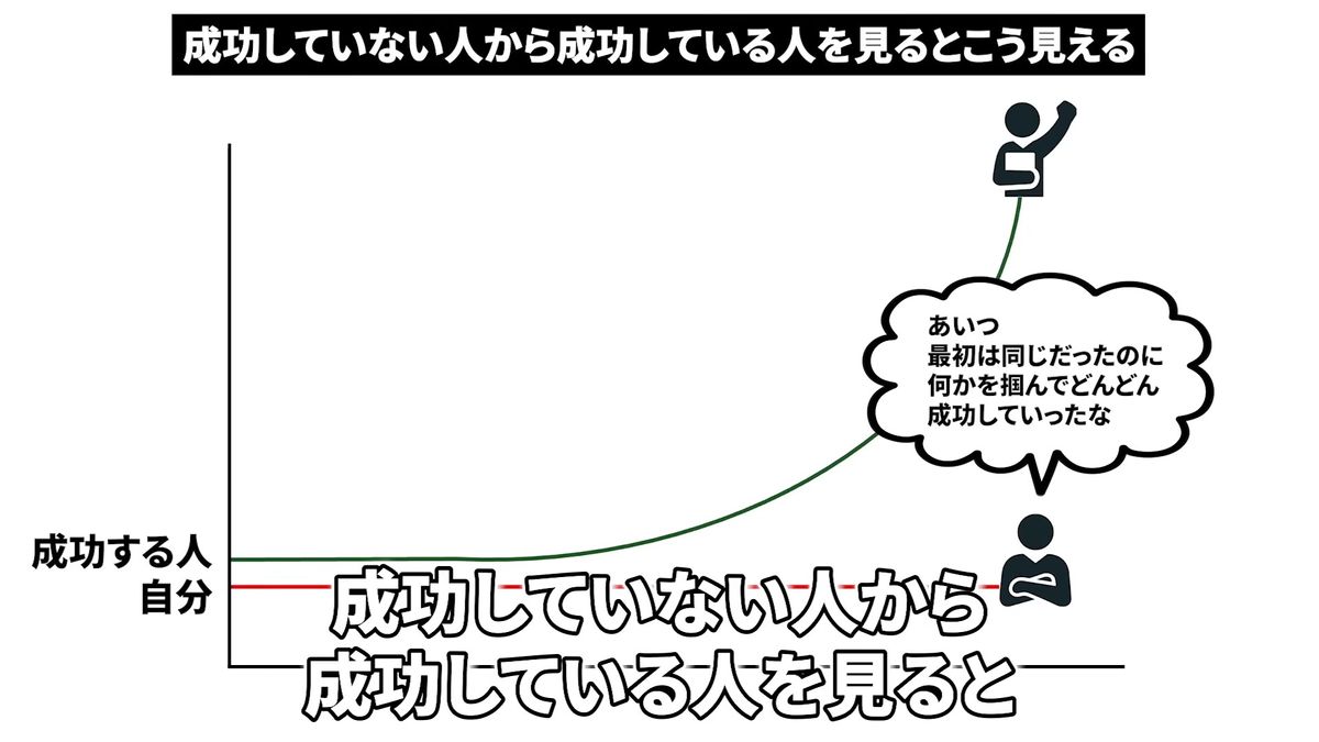これを3者の立場で俯瞰してみましょう。まず最初に成功していない人から成功している人を見ると、このように見えます。これはさっきも見せた図ですね。こんな感じで「あいつ、うまくやったな」みたいな感じで、成功する人がどんどん上に上がっていっているように見えます。