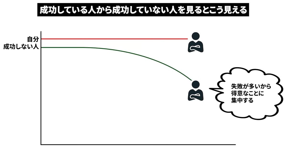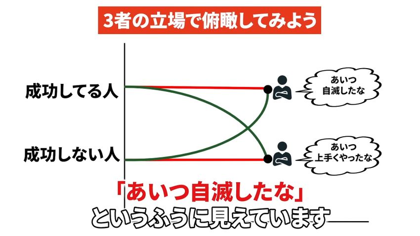 一方でこれもさっき説明しました。成功している人から成功しない人を見るとこう見えます。「あいつ自滅したな」というふうに見えています。