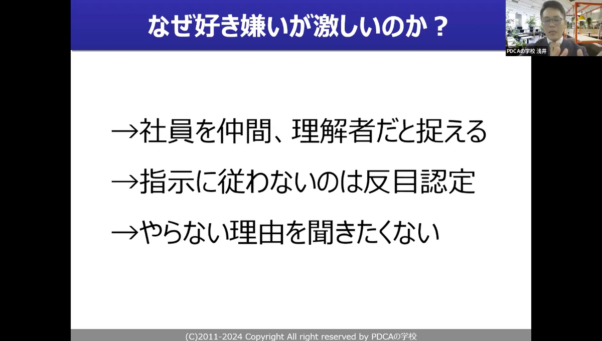あとは「社員は自分の理解者や味方である。なので自分の言ったことについてイエスと言わなかったら、もう反体制だ」みたいな(笑)。こういうことの背景は何かというと、当然社員の改善意識や行動が社長に伝わっておらず、把握していないわけですね。