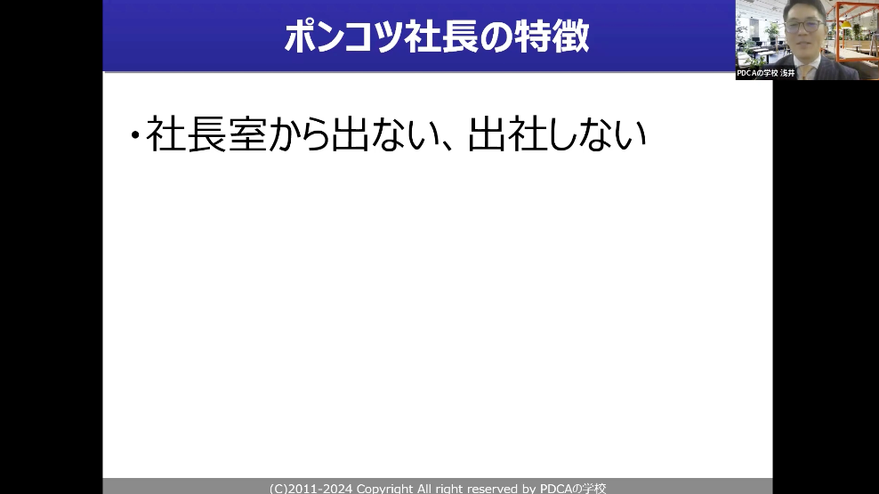 浅井隆志氏:次にポンコツ社長の特徴です。「ポンコツ社長」という表現が非常に強いので大変恐縮でございます(笑)。すみません、実は僕の言葉でポンコツ社長の特徴をまとめたわけではなくて、これは(お客さまの会社の)幹部の方からこういうご相談を実際にいただいているのでまとめているんですね。今日ご紹介しているのは、このご相談が非常に多いんですね。