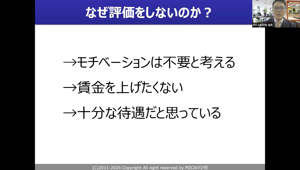「仕事ってそもそも『何時から何時で、いくらで、この業務内容』という条件で働くんでしょ? 決められた条件で働くんだから、別にモチベーションを与える必要はないじゃない。評価をしなくても別にいいじゃん。だって、見合った給料を払うんだから」みたいな発想の方がけっこう多いですね。