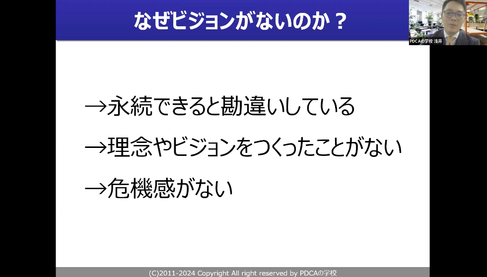 それから「永続できると勘違いしている」「理念やビジョンを作ったことがない」「危機感がない」ということです。すみません、これは非常に言いにくいんですが、実は確かに、当分は永続できるだろうなという会社さんはけっこうあるんですよ。