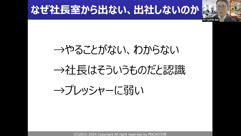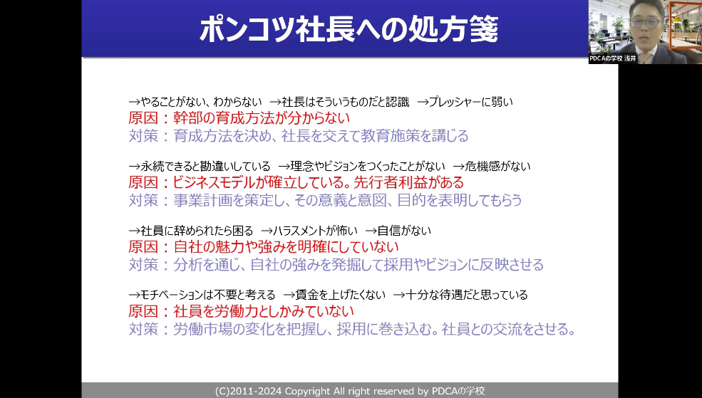 ポンコツ社長への処方箋につきましては、「やることがわからない」「社長はそういうものだと認識している」「プレッシャーに弱い」みたいな社長は、そもそも幹部をどう育成したらいいのかをわかっていないんですよね。