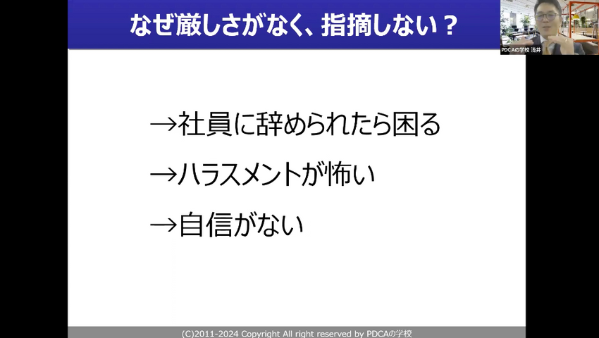 それから、「とにかく社員に辞められたら困る」と、厳しいことを言わない社長もいらっしゃいますね。「ハラスメント(だと糾弾されるの)が怖い」「厳しいことを言って辞められたら困る」と言うんですけど、ものすごく会社に魅力があったら、人間って厳しさを乗り越えられるんですね。