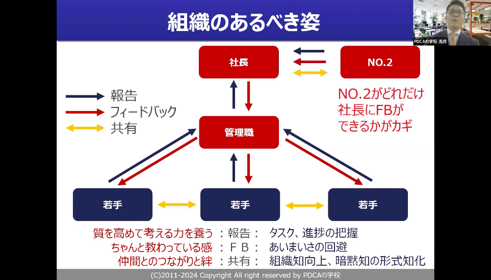 さらに管理職もしくは幹部の方が、社長に対して報告を上げる。それで社長が幹部や管理職の方に定期的にフィードバックをしたりコメントをつけたりする。これが非常に大事になってくるわけですね。
