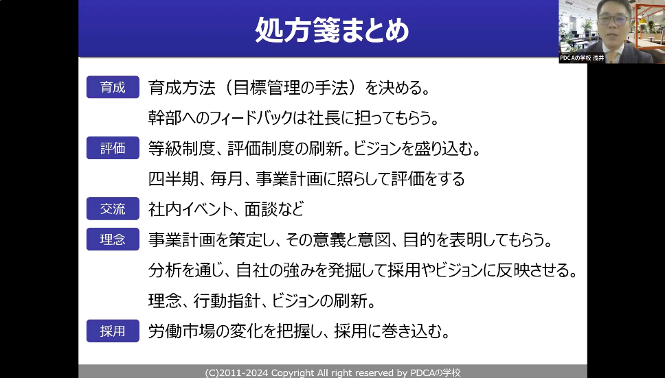 なので、作った事業計画を社長からメッセージで発信するのはいいんですが、それを四半期や毎月、毎週の行動管理や評価面談の時に紐づけて、再度それを伝えられるかという仕組みもすごく大事になってきますね。(スライドの)このへんは今説明したようなところです。