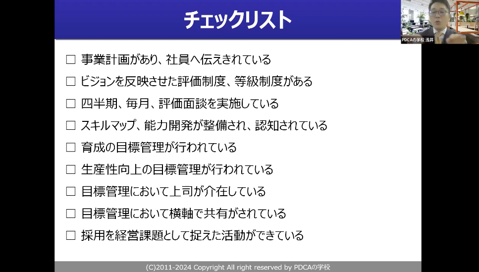 それから「育成の目標管理がなされているかどうか」「生産性向上の目標管理がなされているかどうか」。これはものすごく大事ですね。目標管理とは簡単に言うと、目標値を定めて行動計画と振り返りをして検証作業をしていくという、いわゆるPDCAですよね。