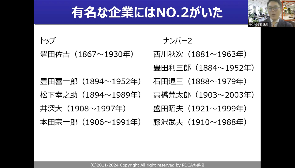 今回はNo.2の方にご参加いただいておりますが、ちなみに企業はやはりNo.2や右腕・左腕の方が非常に大事になってくるわけですね。