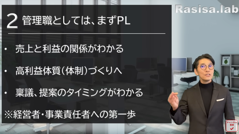 その中でまず管理職はPLだけを押さえます。そしてPLを読めないと、こうなっちゃいますよということも最初にお伝えします。そして最後にPL、これだけあればいいですよという読み方、使い方みたいな話をしていきますので、ぜひ楽しみにしてください。