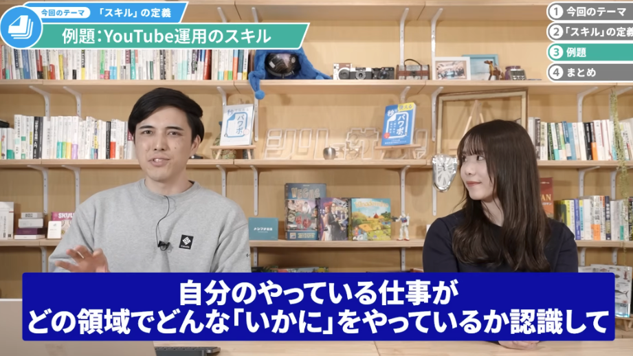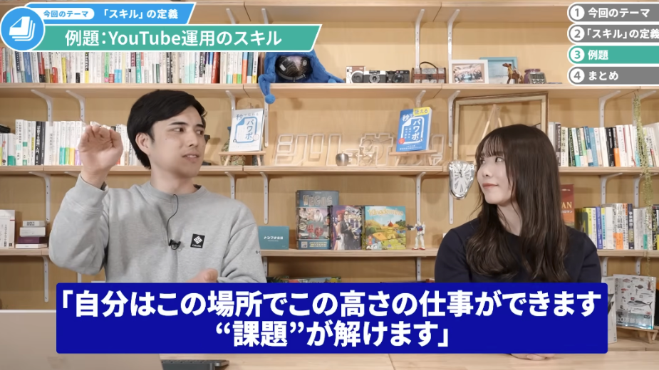豊間根:要はね、「課題」というのは、イコール、ほぼ「スキル」なんだけども、場所と高さがあるんですよ。今、YouTube運用というピラミッドの中で、動画1本をいい感じにするとか、もしくは、テロップ1個をうまく入れるみたいなところから、「いかに」の階段を上っていくみたいな話。