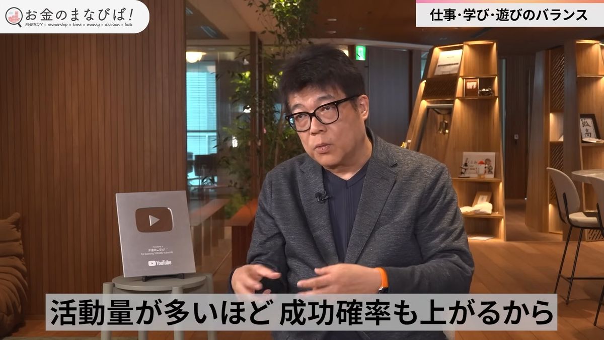だから、遊びでもあるし、楽しみでもあるから、あまり疲れることはない。そうすると、仕事を無限にやることができるし、無限にやったら結果も出る可能性が高くなるし、それは活動量が多いほど成功確率も上がりますよね。
