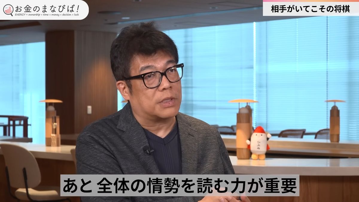 それはたぶん、俯瞰する物の考え方とか、損得を瞬時に判断することだと思うので、投資と将棋につながった世界があったんだと思うんですよね。ひょっとしたら、将棋的感覚を投資で活かしていて、投資の感覚・投資のレベルが上がるうちに、将棋的感覚が磨かれたという面もあったのかもしれません。