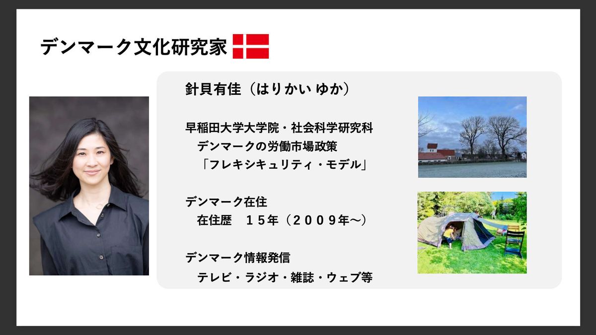 まず自己紹介ですが、私はデンマーク文化研究家として活動しています。もともと日本の大学院でデンマークの労働市場政策を研究していました。その後デンマークに移住し、暮らしながら見えてきたことを日本に向けて15年間発信してきました。