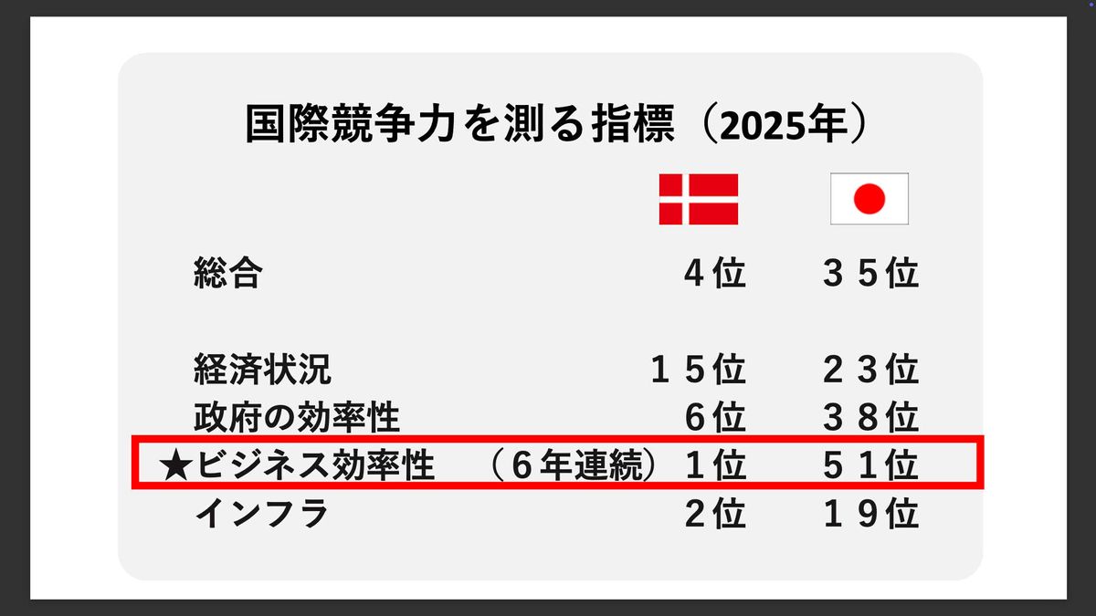 このランキングは「経済状況」「政府の効率性」「ビジネス効率性」「インフラ」という4つの指標の総合評価で決まります。その中で特に注目すべきはビジネス効率性です。デンマークは2025年も含めて6年連続で1位、日本はこの項目が最も弱く、51位という結果でした。
