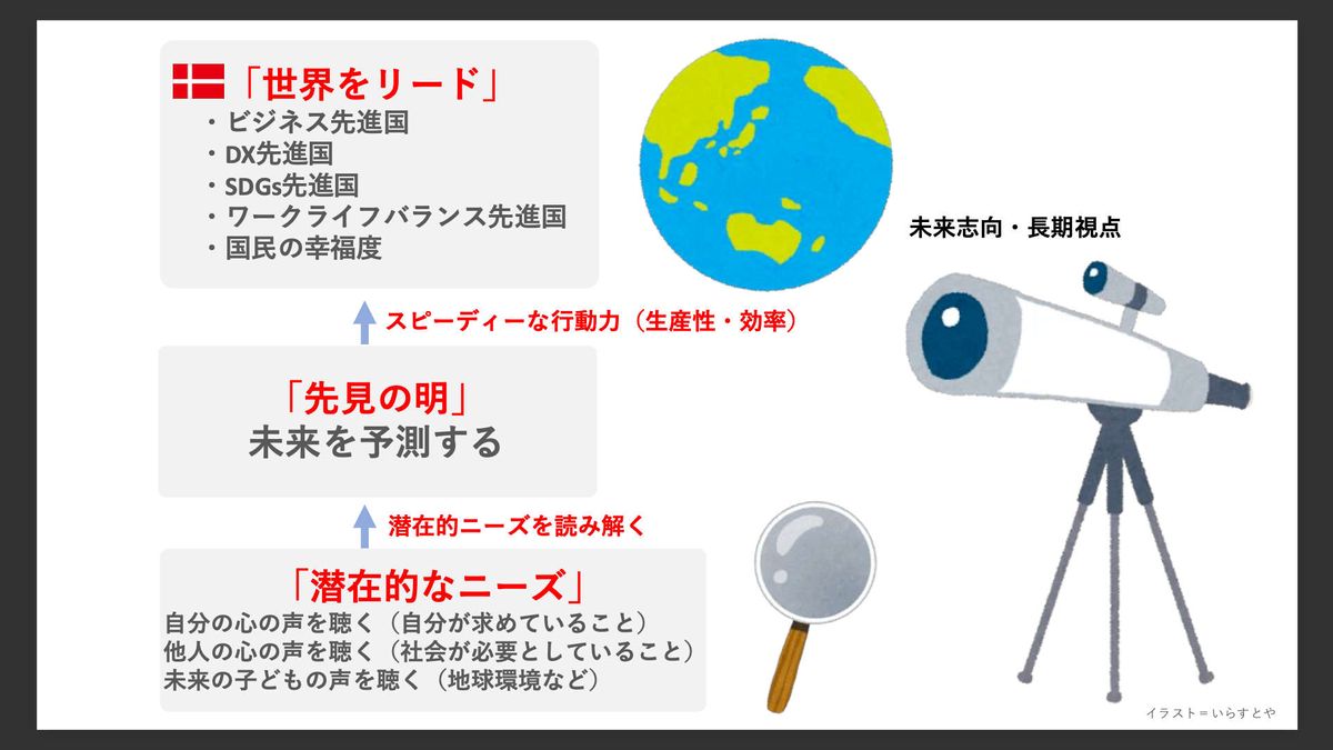 ・デンマーク文化研究家の針貝有佳氏は、デンマーク人が「心の声を聴く」ことで先見性とスピード感を持ち、効率性を高めていると指摘。